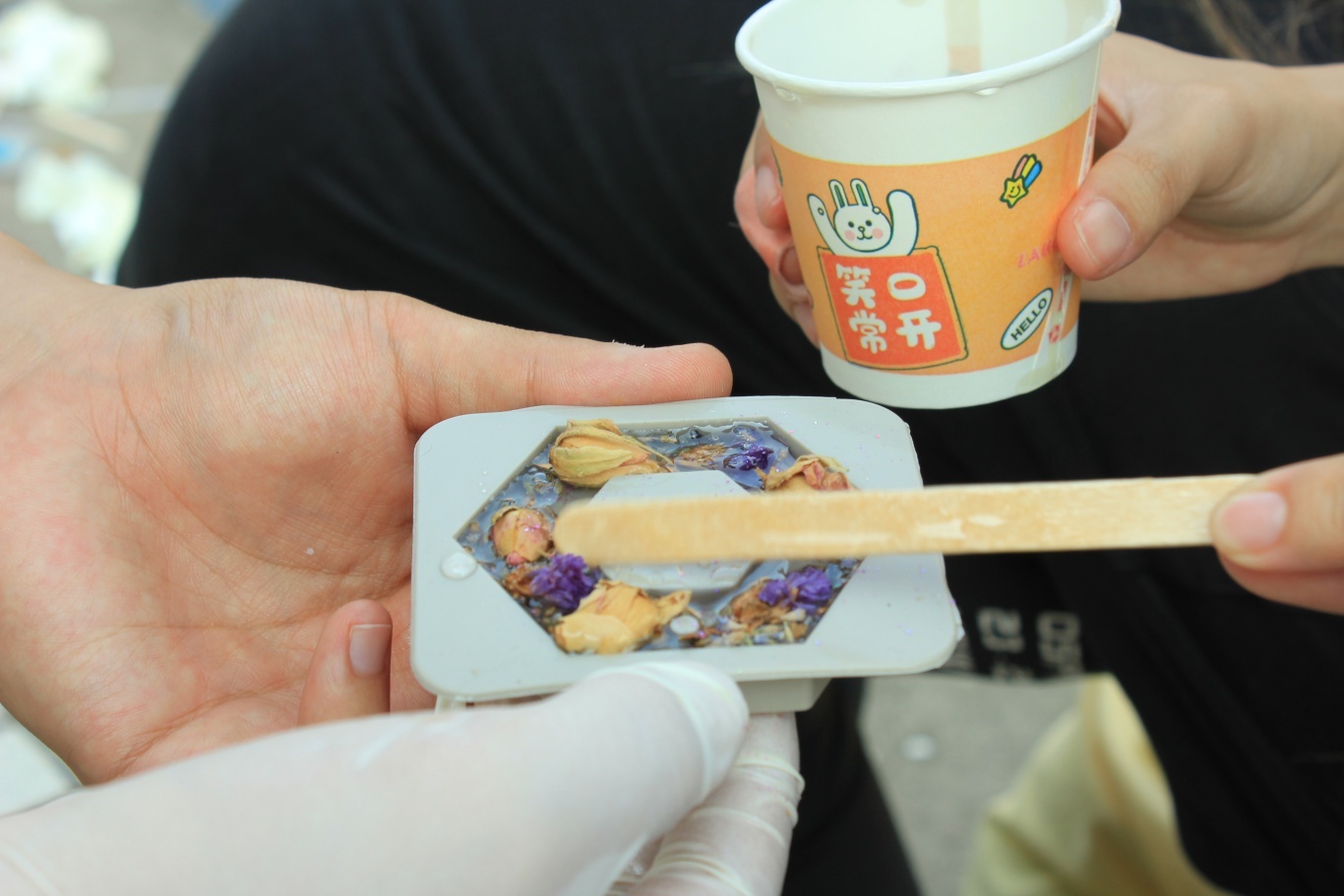 植物滴胶的制作过程充满了团队合作与个人创意。有经验的同学耐心指导初学者,大家分工协作、互相学习。有人将花瓣拼贴成精致的微型花窗,有人巧妙拓印叶片纹理于胶面。每一份作品都凝聚着集体的智慧与个人的巧思,展现了团结互助、共同进步的精神风貌,让每一片花叶都在集体的土壤里绽放出独特而立体的光彩。