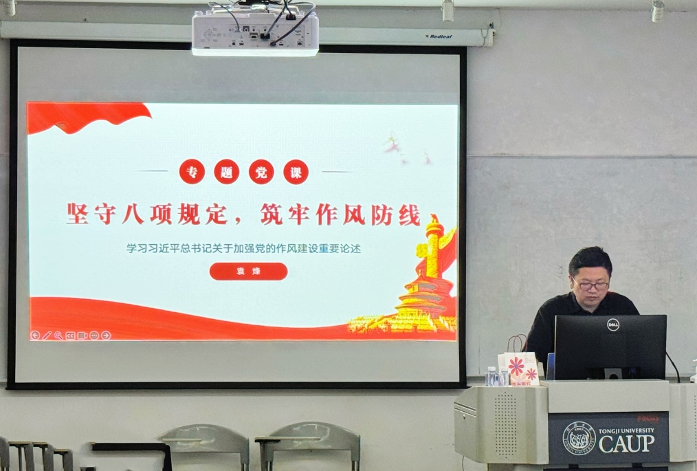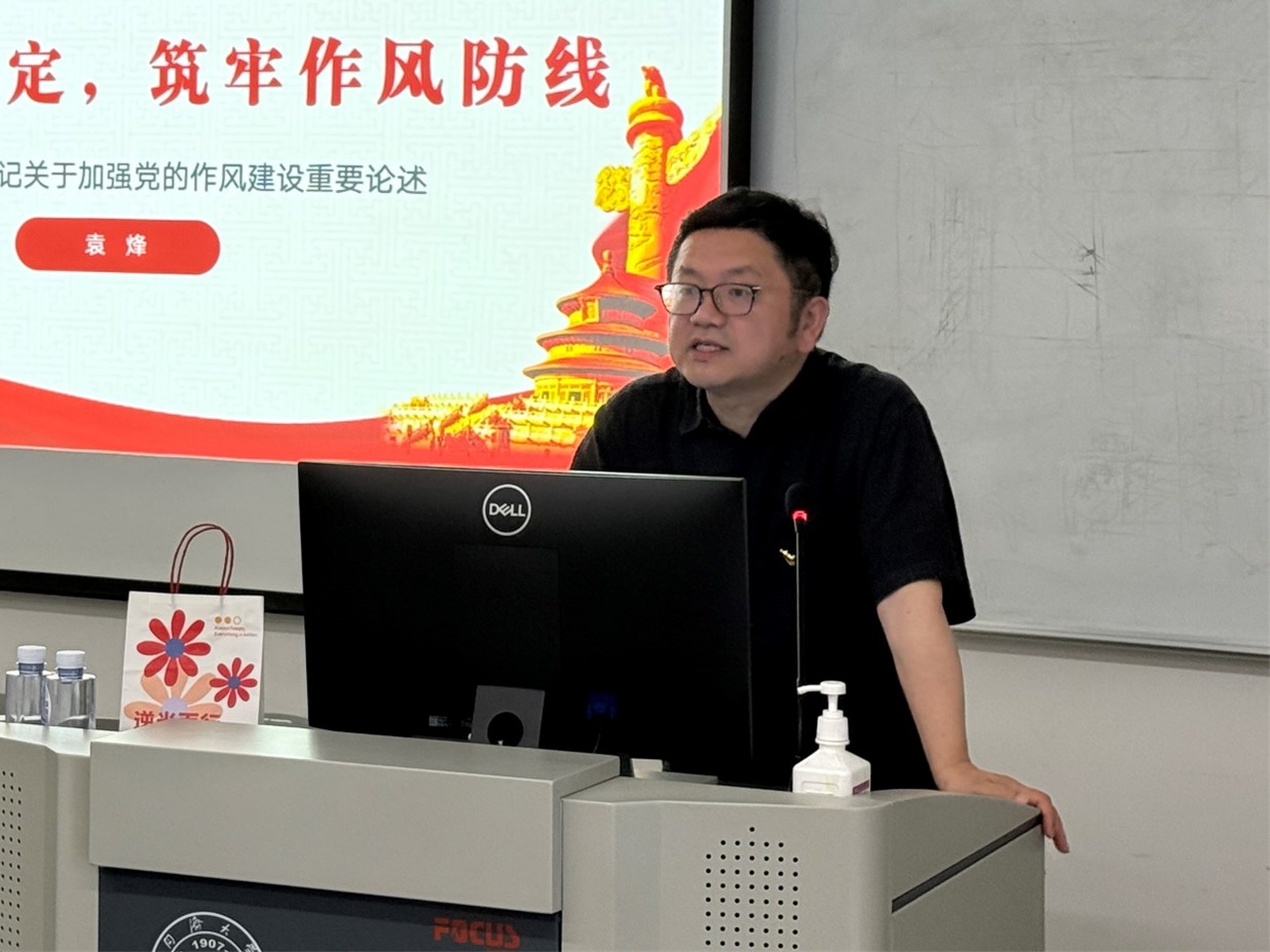 会议伊始,袁烽同志为全体党员精心准备并呈现了一场令人深受启发且极具实践指导意义的党课,主题为“坚守八项规定,筑牢作风防线——学习习近平总书记关于加强党的作风建设的重要论述”。他以高度的责任感和扎实的专业素养,从现实工作和教学实践出发,巧妙地将理论与实际紧密结合,精心挑选了多个生动鲜活的实例加以佐证和阐述。