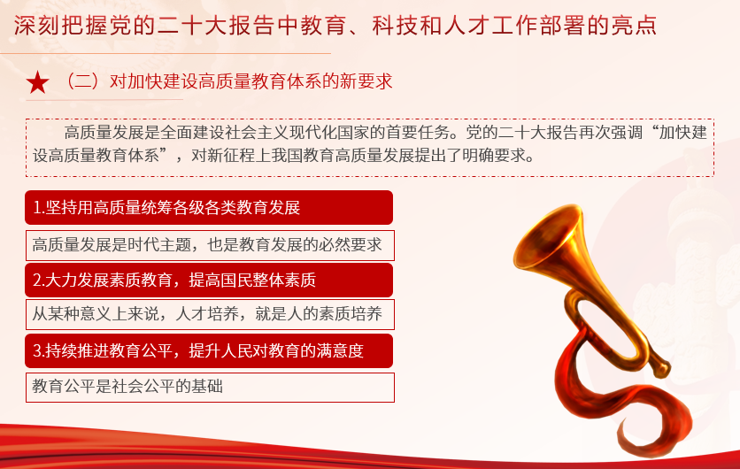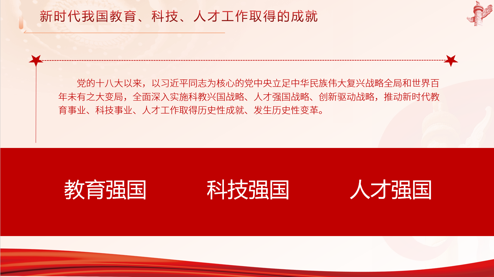大会强调了教育的重要性,因为它是建设强大国家的基础。党对提高教育质量和促进教育创新的承诺值得称赞,科学技术对中国未来的发展也至关重要。大会认识到促进科技创新的重要性,强调要加强基础研究和开发。通过推动创新,提高科技素质,中国可以在实现强国目标的道路上不断取得进步。最后,大会还强调了人才发展的重要性。党认识到在中国吸引和留住顶尖人才的重要性,并致力于为人才的成长提供支持和机会。通过促进人才发展,我们才能继续建设一个强大而繁荣的国家。