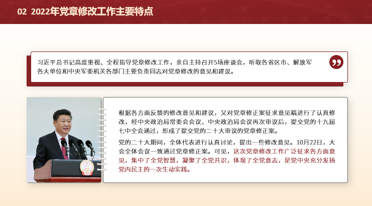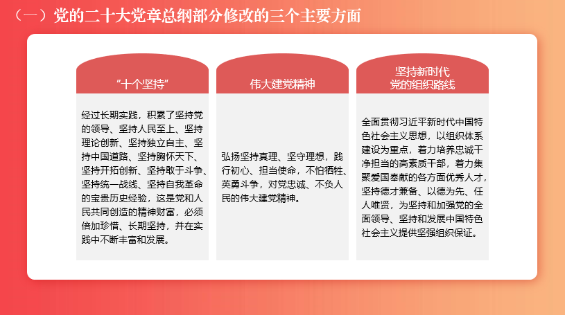 刘政同学具体介绍了党的二十大党章修改的重大意义与主要内容,增强党性修养。首先,刘政同学从党的二十大党章总纲部分修改的三个主要方面入手,介绍了中国共产党“十个坚持”和伟大建党精神,以及坚持新时代党的组织路线,为坚持和加强党的全面领导、坚持和发展中国特色社会主义提供坚强组织保证。修正案还加强了党的组织结构和治理。他们强调,要提高党的领导能力和治国能力,建设纪律严明、效率高、效益好的党。他们还呼吁建立新的监督体系,以加强党的反腐败工作。