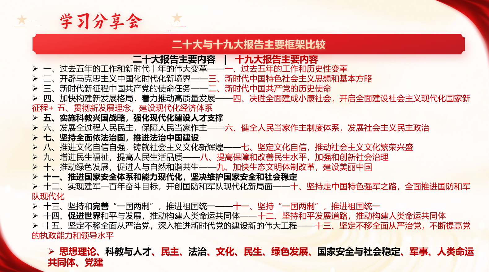 井之源介绍了二十大与十九大报告的摘录比较学习,首先,两份报告都强调了党对治国理政各个方面的领导的重要性。十九大报告提出“坚决保持和完善党的全面领导”,二十大报告强调要加强党的领导,提高党的执政能力。