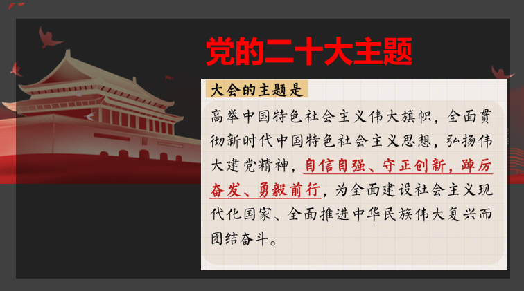 李欣带来了关于二十大主题内容的分享,介绍了二十大主题、六个坚持、两步走,五个重大原则等二十大的核心内容。党的二十大提出的20个主题、六个坚持、两个步骤、五项重大原则,体现了党推动高质量发展、全面建设社会主义现代化国家的决心。“六个坚持”强调坚持党的领导、增进人民福祉、推动高质量发展,这也与我有共鸣。这些原则体现了党促进社会公平正义稳定、改善民生的决心。大会讨论的到2035年实现社会主义现代化和到本世纪中叶建成社会主义现代化国家的两个步骤,反映了党对中国发展的长远设想。这些步骤要求党继续坚持其原则和价值观,并为实现其目标而不懈努力。最后,大会讨论的五项主要原则,包括坚持党的领导、弘扬社会主义价值观和加强党的纪律,反映了党对改进组织结构和治理的承诺。这些原则对于确保党继续成功地领导中国走向更美好未来的目标至关重要。