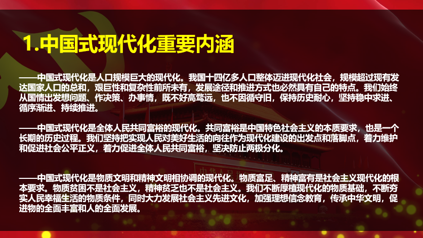 李帅同志从中国式现代化重要内涵入手,为我们介绍中国式现代化的本质要求和理解,大会肯定了过去五年中国经济发展取得的成就,强调要从数量型增长转向质量型增长。这包括关注创新、提高人们的生活质量以及应对环境保护和可持续发展的挑战。中国式现代化就是坚持中国特色社会主义道路。坚持以经济建设为中心,坚持四项基本原则,坚持改革开放。坚持和加强党的全面领导。坚决维护党中央权威和集中统一领导,把党的领导落实到党和国家事业各领域各方面各环节,坚持以人民为中心的发展思想。维护人民根本利益,增进民生福祉,不断实现发展为了人民、发展依靠人民、发展成果由人民共享,让现代化建设成果更多更公平惠及全体人民。