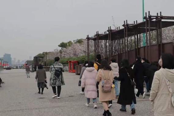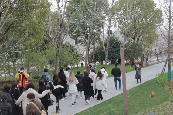 同学们在讲解员引导下徒步游览滨江