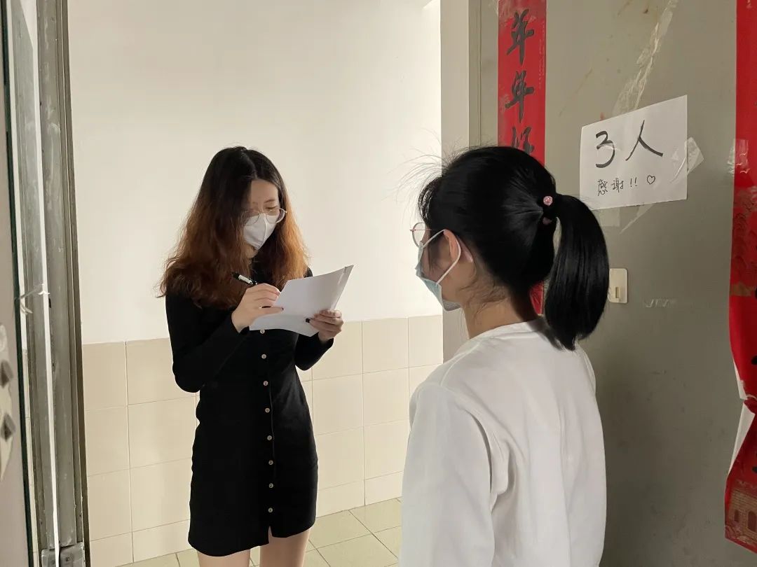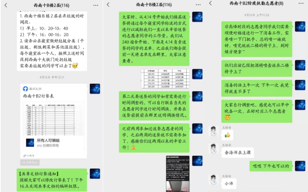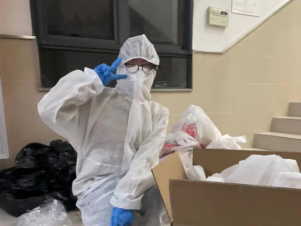“在疫情封校过后,社区辅导员联系上了我,问我能否加入到南校区的员工志愿服务工作中,我很快答应了。由于我住在西南十楼,于是我成为了西南十楼的一名社区网格员。每个楼层都有2到3名的网格员,我主要负责的工作是楼层同学每天的订餐收集汇总以及招募安排所在楼层的送餐、送物资、防疫执勤志愿者。在封校的初期,由于同学们还没有适应封校的生活,许多的工作都是从零开始,因此我们也遇到了很多问题如:有同学忘记订餐第二天没有饭吃、有同学忘记了当天要做核酸、有同学出门忘记戴口罩……面对这些问题,其实有很多是因为我们的工作方式存在问题造成的。因此我们听取同学们的建议,学习其他楼层好的工作方式,不断改进,使得同学们渐渐适应了封校期间的生活。在楼层志愿者工作方面,一开始招募到的楼层志愿者数量并不多,他们在持续不断地工作了两周之后也逐渐显露出疲态,于是我们通过轮流排班的方式让楼层内的每一位同学都加入到志愿者的工作中。而在组织志愿服务的过程中我发现没有一位同学表示过拒绝。在疫情面前没有一个人可以置身事外,每一位同学其实都以不同的方式成为了‘战疫先锋’,默默地为抗疫工作做出着自己的奉献。最后希望疫情能够早日结束!”