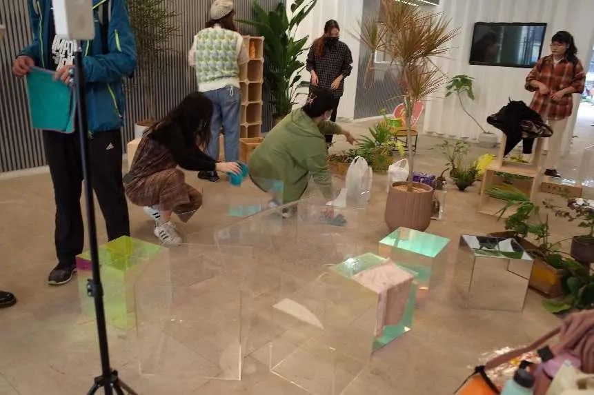 支部党员清点并集中搬运待栽植物与所需装置和植物盆栽,对花园节搭建所需的亚克力盒进行细致的清洗工作,并根据设计图纸初步摆放好各装置的位置,形成层次多样丰富的场景效果。