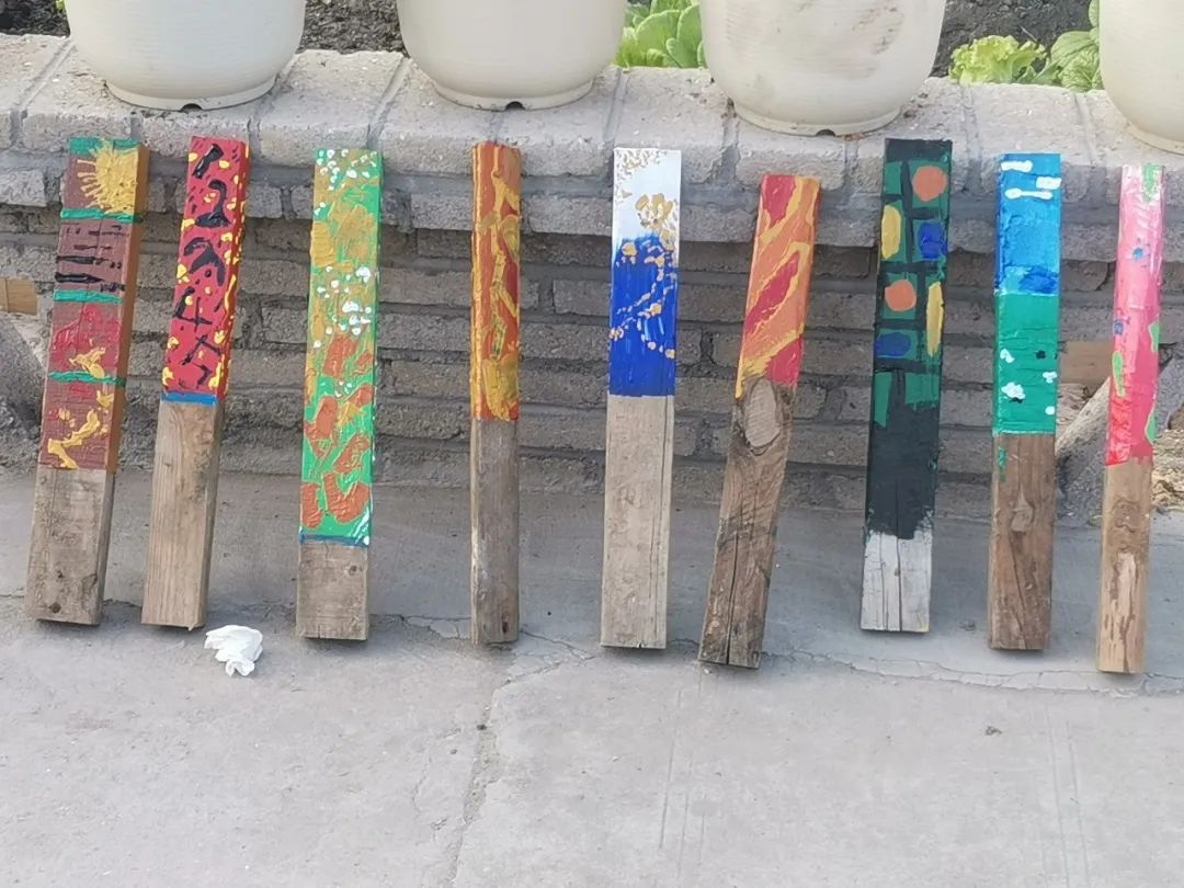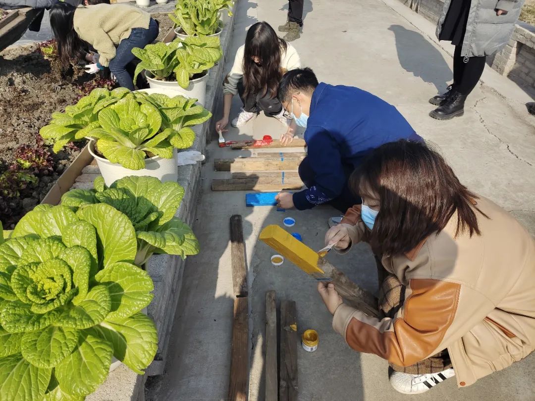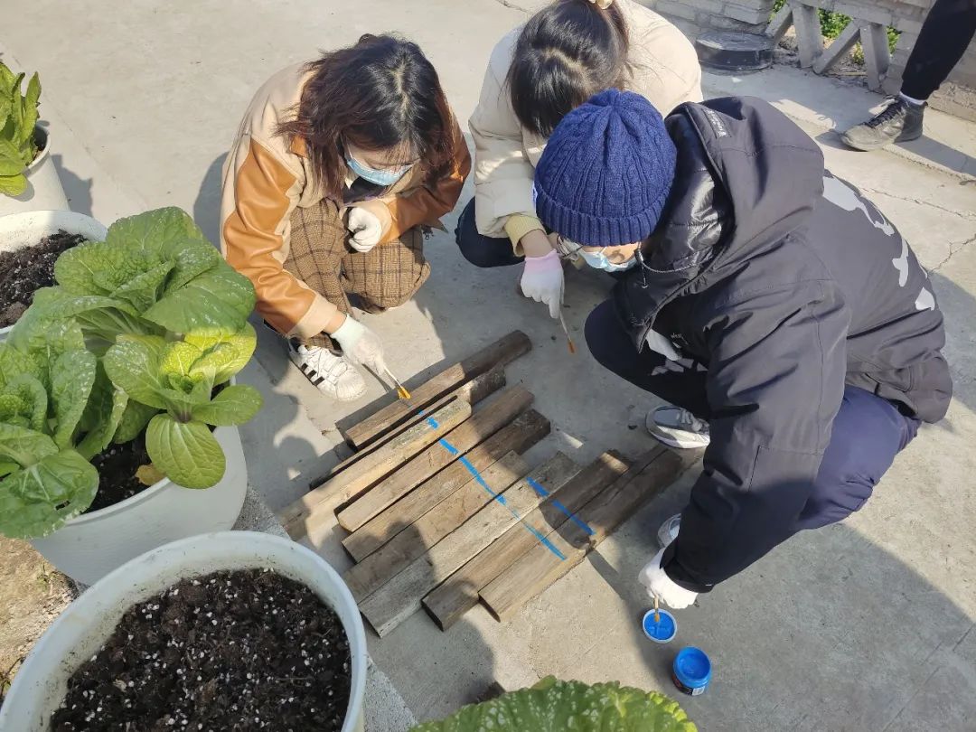 下午,在基本完成可食地景的种植后,同学们开始参与到零废花园的设计过程中。通过利用乡村内的废弃木材,进行创意彩绘,再将它们“种”回土地中装饰蔬菜花园。此次活动,不仅可以充分利用乡村建设中的废弃物,实现“零废”的理念;还能让同学们通过美育教育,在欣赏美、感知美、创造美的过程中收获情感和精神上的愉悦体验。这些彩绘的小型装置,为蔬菜花园增加了趣味与情调,是共创共治的乡村生产景观的生动注脚。