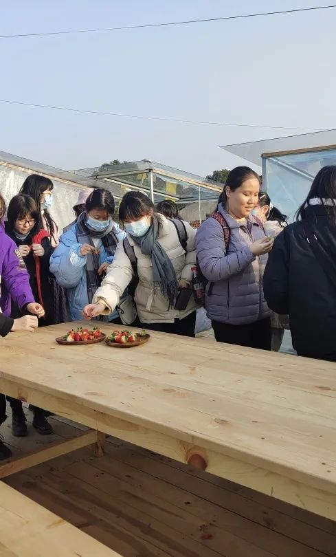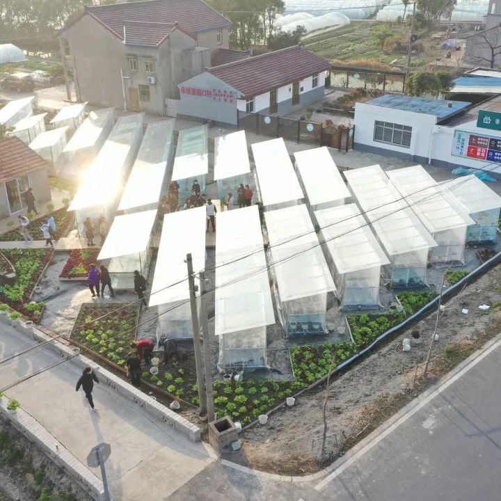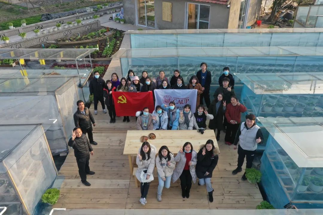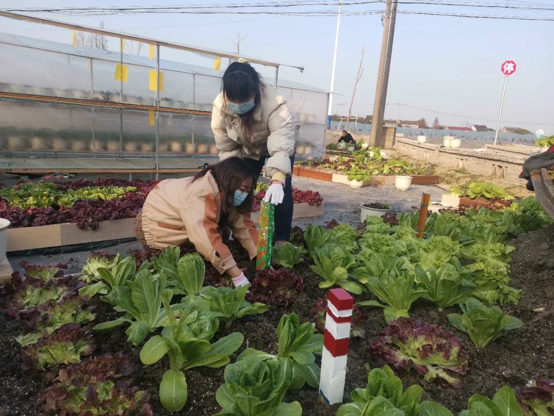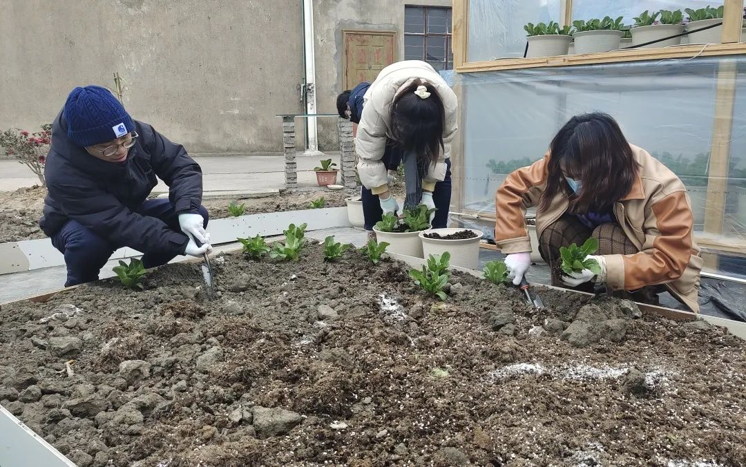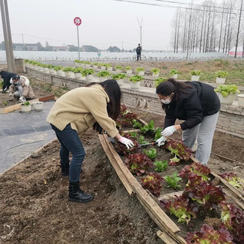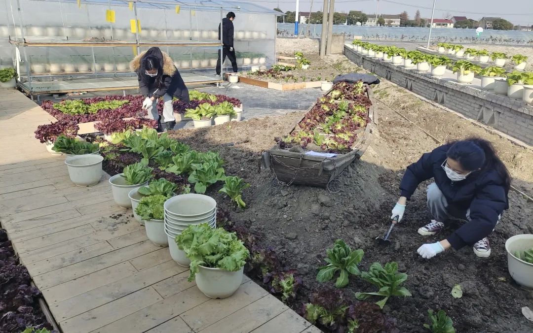 在研究生第十一、十二支部书记吕婉玥和李帅同学的带领下,支部成员与济美学堂的同学两两分组,在农业园基地内的三角空间内进行可食地景的种植与微景观的提质改造。本次设计实践,充分呼应乡村独特的风貌和地理条件以及农业园区的产业性质,利用大棚内现有的成熟蔬菜替代花卉进行植物造景,尝试将乡土景观与可食地景结合。