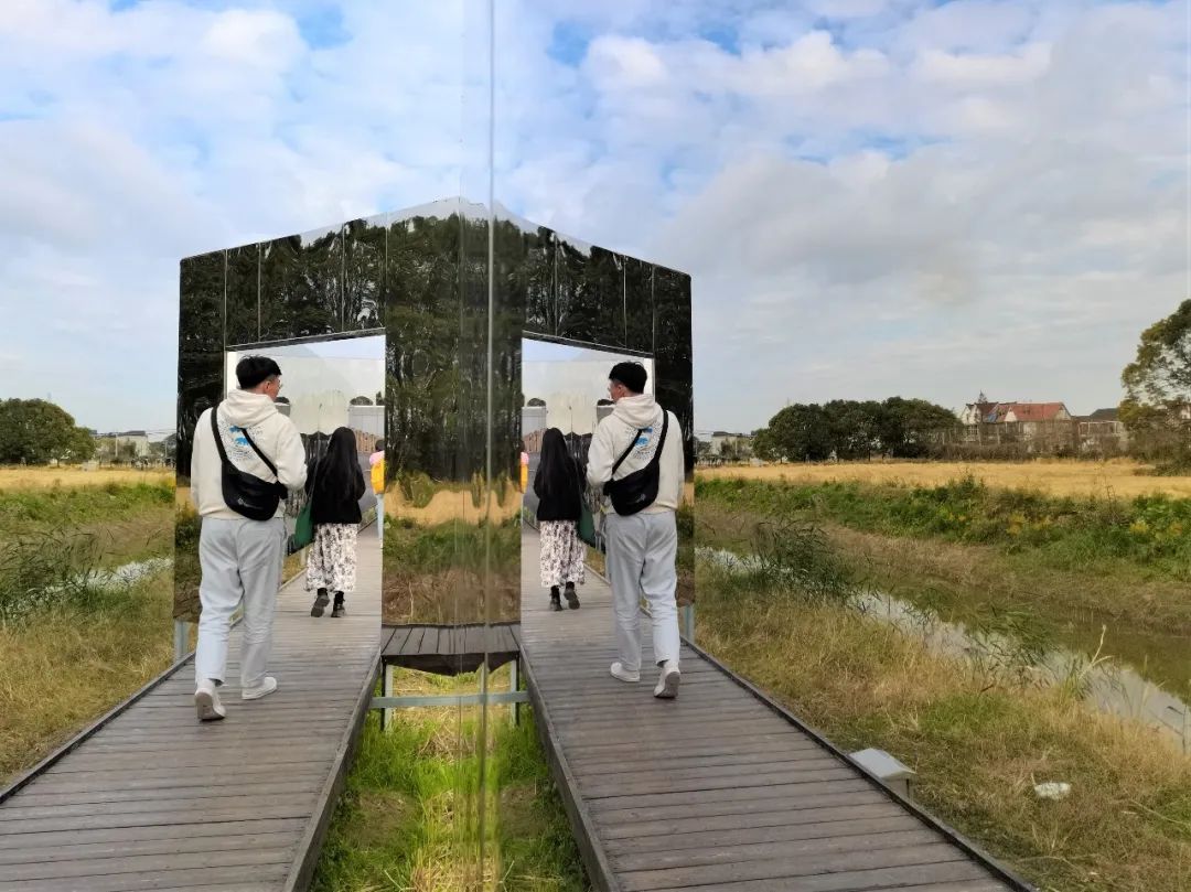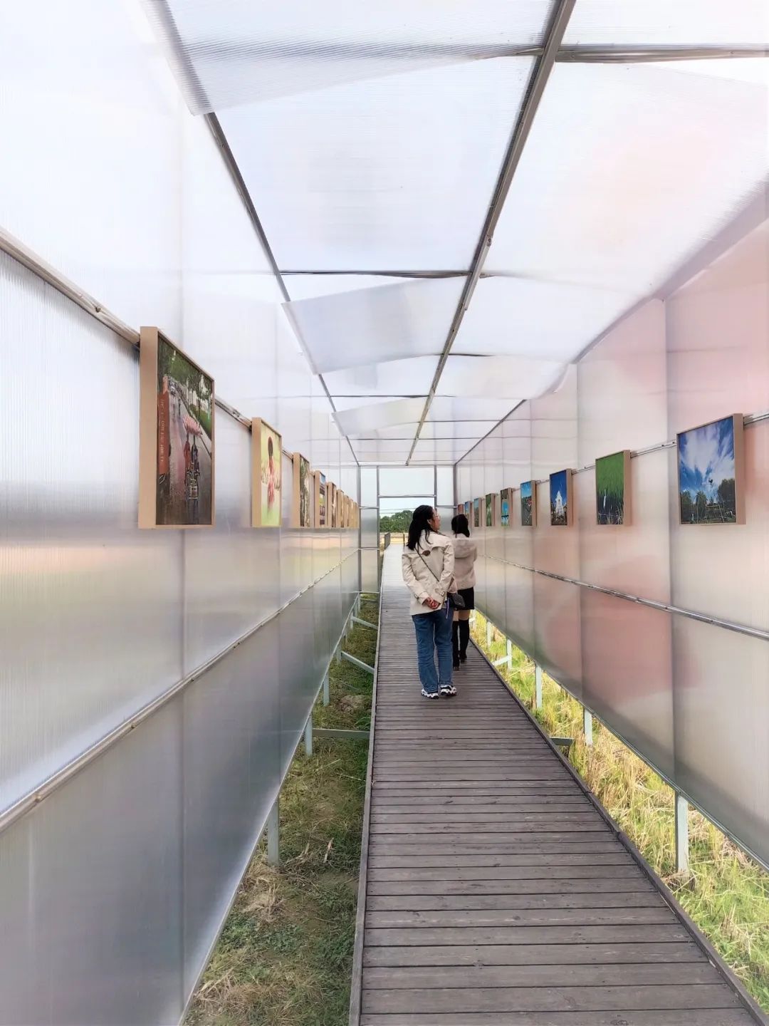 一行人继续前行,来到了2021城市空间艺术季“吾乡之民”摄影展。摄影展设在稻田一侧长廊内。长廊通过材料变化和镜面反射,扩展了空间的视觉边界,在装点大地景观的同时收藏了乡村中的美好生活瞬间。