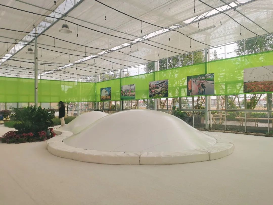 展厅柔和的彩色分割围合出灵活可变的展览、活动空间,花卉景观贯穿其中,不同地面材料塑造出丰富的起伏感。
