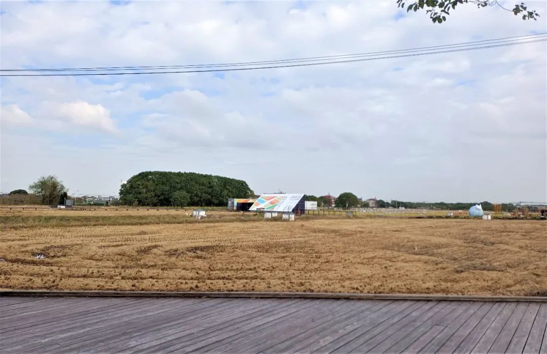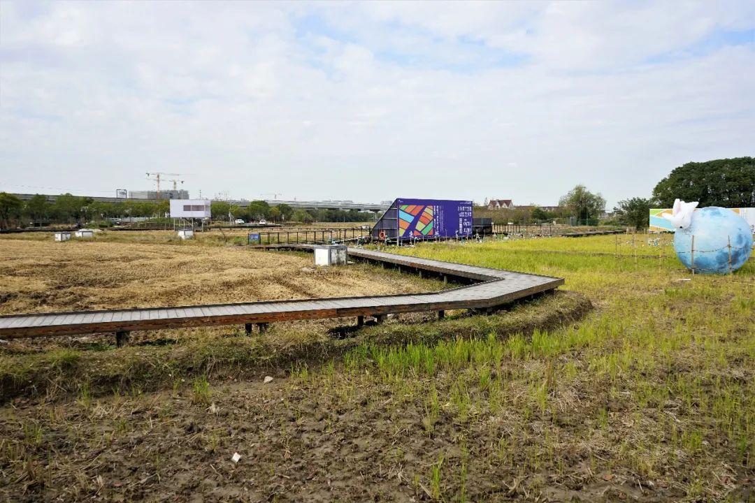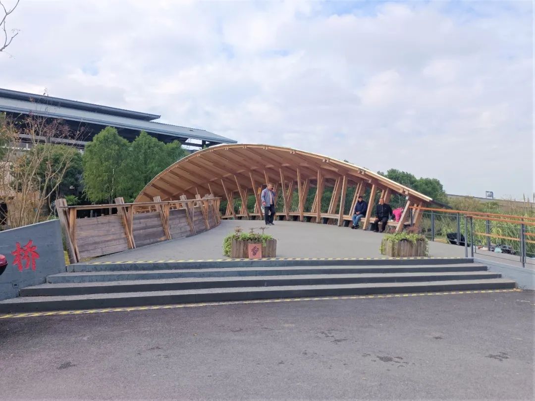 在轨道交通出口,一座弧形木质拱桥成为城市到乡村的转换节点。我们在此走出喧嚣,与扑面而来的大片稻田撞个满怀。桥面由宽到窄,连接了轨交站点和大片稻田。