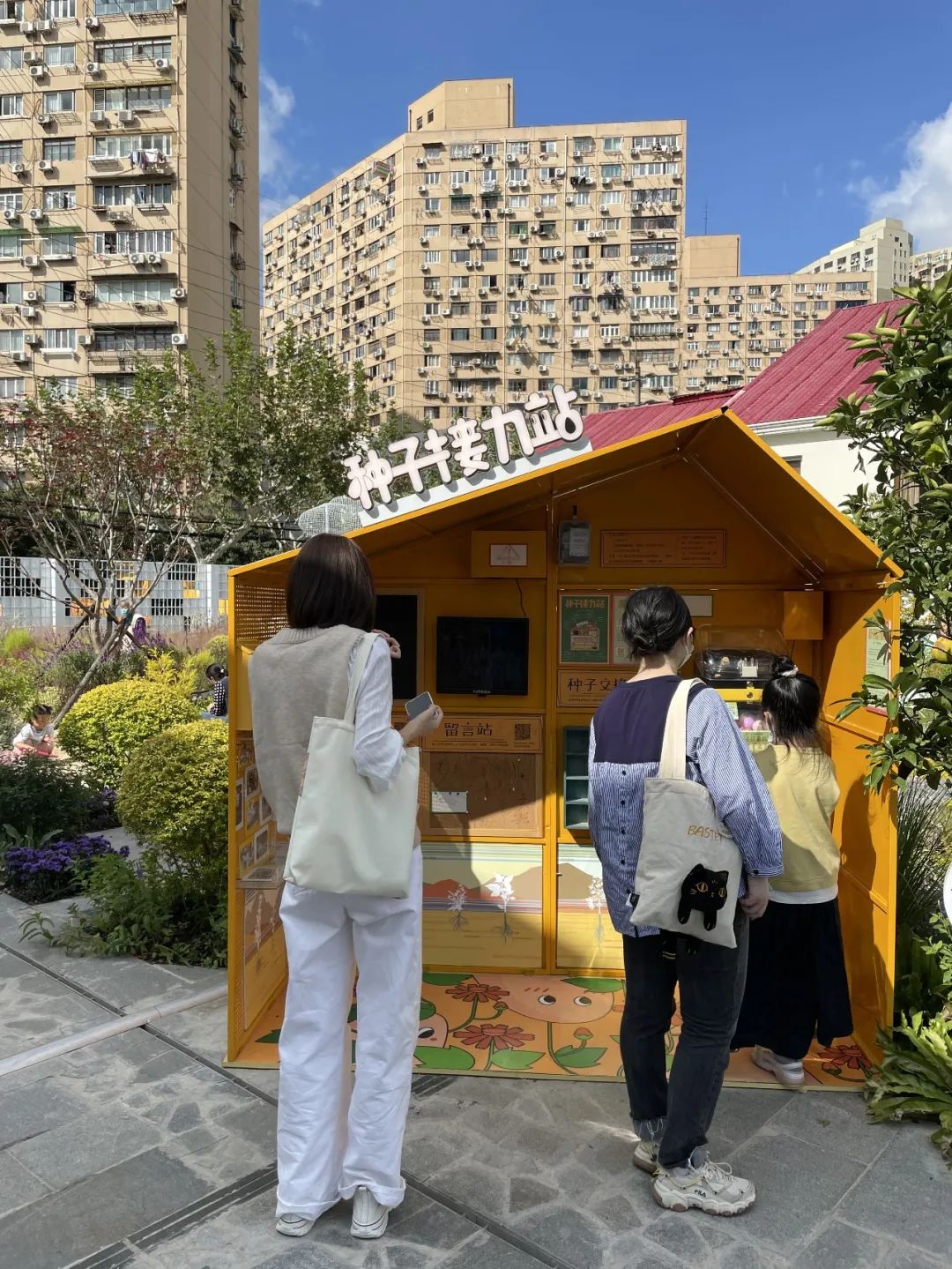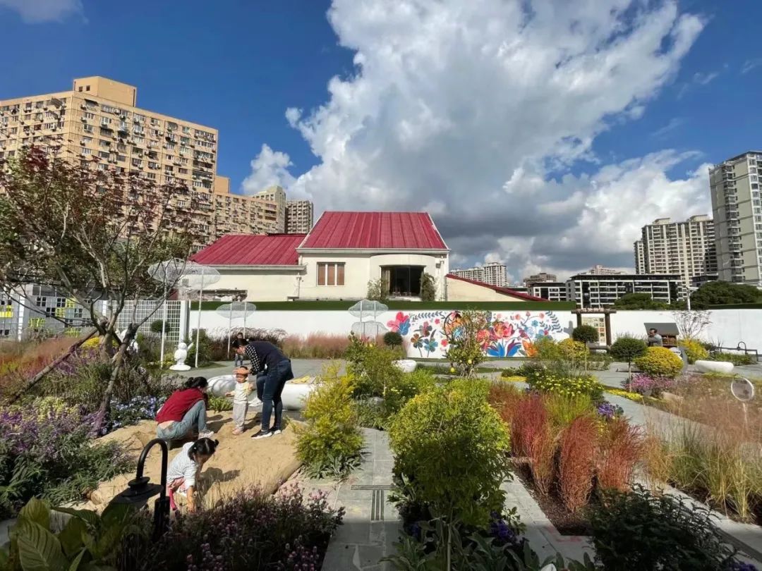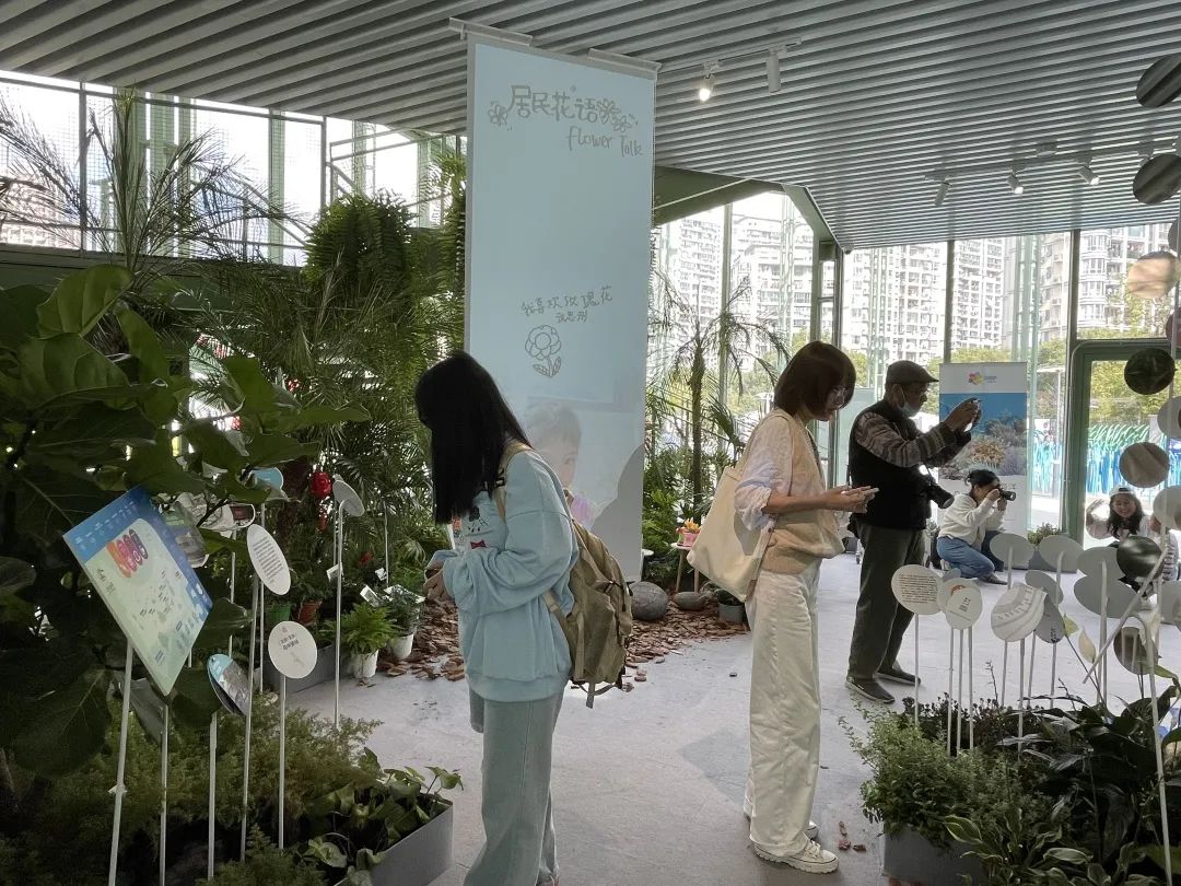 田林社区展场所在处原本为钦青花鸟市场,它的存在阻碍了居民亲水的视线。改造通过拆除违章建筑,扩大了居民的观景视野,实现了城市线性的廊道连接,创造出了一个服务于居民的社区生活中心。经由设计师的设计参与,更新以田林社区为“面”,展示和发掘出了社区生活的多样性,激发了社区自治的新思路新模式,并营造出了8600平方米的多功能城市公共空间。一进入展场入口,“SUSAS”雕塑字母上坐着嬉戏玩耍的小朋友,展区内重塑着大自然的各种场景。小朋友追逐蝴蝶,穿梭在以草为意象的绿色海绵条之中捉迷藏;母亲和女儿与花合照。在钢筋混凝土包裹的城市里,这块园区为人们提供了与大自然和谐相生的生活方式,无论是大人小孩还是老人,都可以找到自己喜欢的地方和活动。这是理想的城市空间该有的样子,人们的互动在公共空间中不经意被触发。花房驿站中有种类丰富的植物展示;室内展区中展出的居民花语通过公共装置实现了居民与社区的交互,提升了社区公众参与度,居民们用最朴实的语言写出了对美丽城市空间建设的期盼和对未来美好生活的向往。