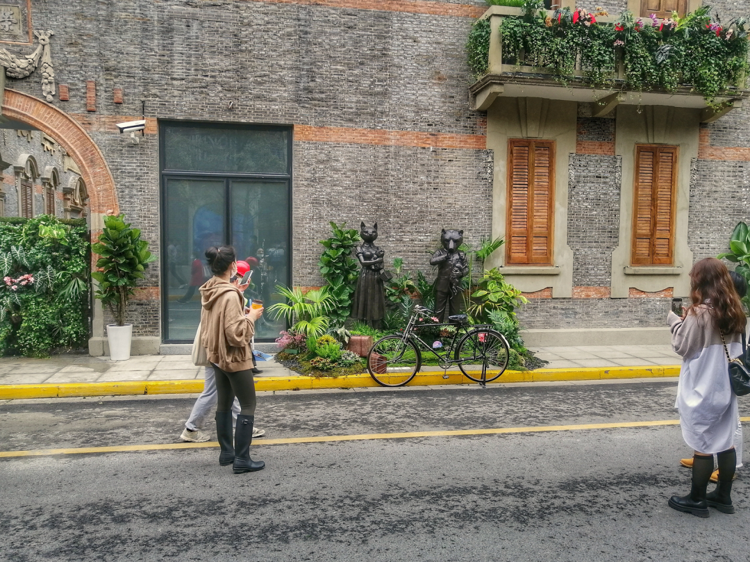 茂名北路上,步行街区在国庆期间限时开放,艺术展以“花繁叶茂·艺术名街”为主题,将雕塑艺术融合于公共空间之中,使行人在亲近、触碰和互动的过程中感受石库门里弄天井的独特空间。