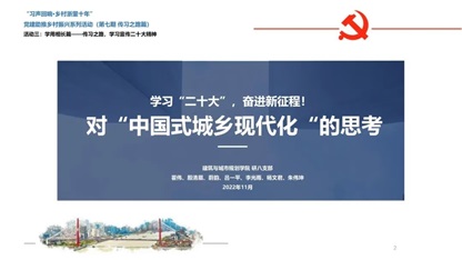 为积极响应党的“二十大”精神,研八支部进行“学用相长”主题分享,积极学习党的“二十大”内容,学习未来国家重大发展战略与习总书记重要讲话。学习内容结合对党的理论与专业背景的理解,紧紧围绕“人民城市、乡村振兴、空间高质量发展”等内容,展开对于“中国式城乡现代化”的思考,形成了部分思考成果。该篇章由霍伟同志统筹负责,由霍伟同志代表本活动小组进行交流汇报,小组成员为殷清眉同志、蔚韵同志、吕一平同志等共七名支部成员。