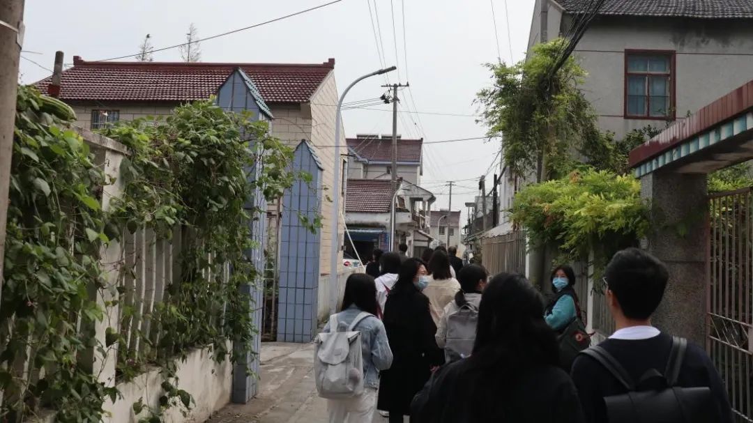 介绍完规划与发展现状,栾峰老师和虞指导带领同学们参观了外灶老街。外灶老街历史悠久,现在仍是外灶村村民生活中的一条重要街道。2019年,外灶老村曾被评为上海市美丽乡村示范村。如今,以建设美丽庭院为主要内容的外灶村美丽乡村创建,在“党建引领、集体示范、妇联主抓、条线配合、村民主体、长效维护、家门口延伸”的机制下,在外灶老街继续推进。