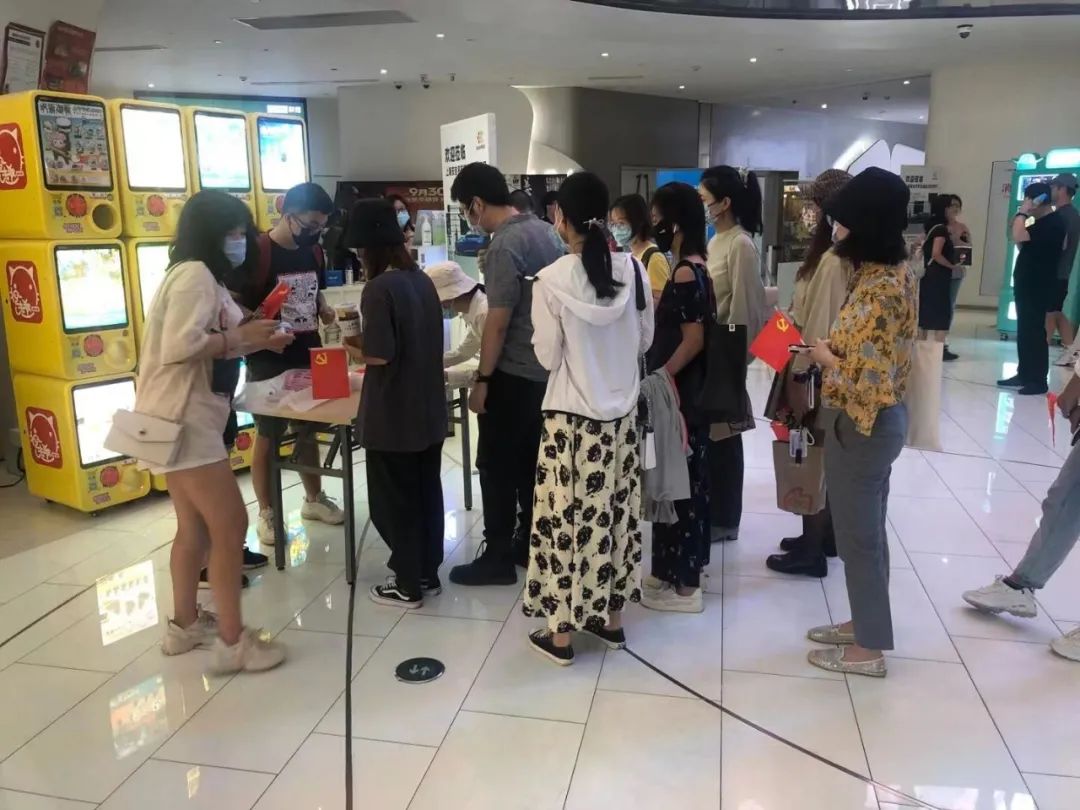 研究生第四党支部的党员们早早来到五角场合生汇中影国际影城,等候在影院入口处为参与活动的党员们分发电影票。