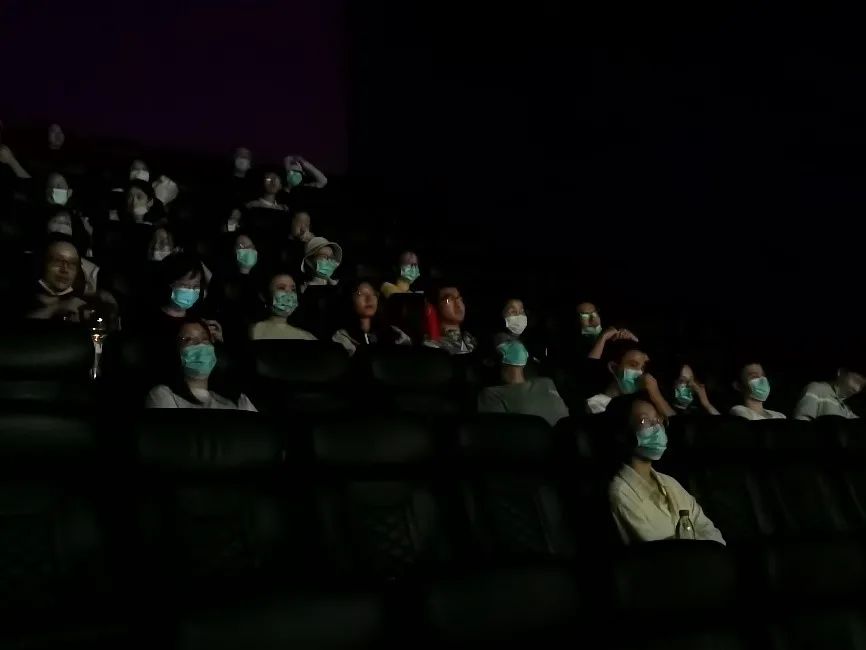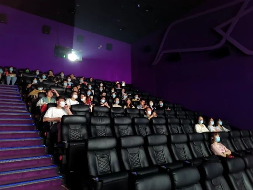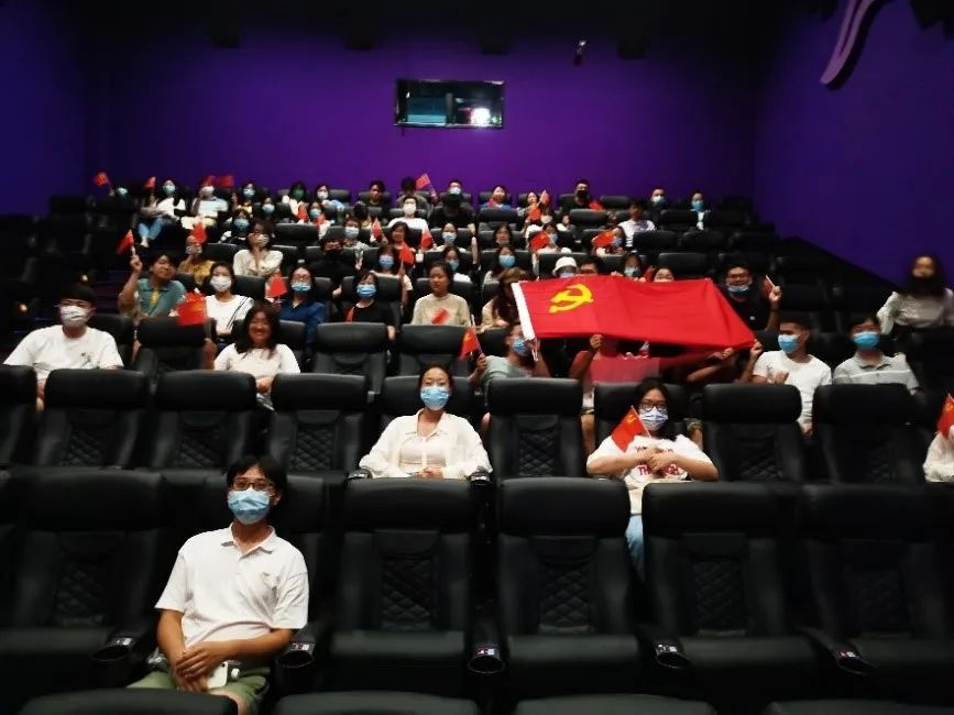 观影活动历时三个小时。电影结束,大家都还沉浸在电影的剧情中。灯光亮起,大家纷纷举起党旗,在影厅合影留念。