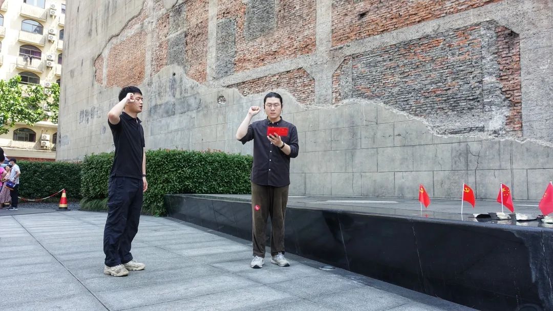 当天10:00,在上海四行仓库纪念馆西墙外,支部书记王雨林领宣,为新近接收的预备党员姜晟同志举行庄重的入党宣誓仪式。