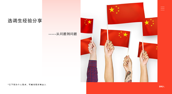 紧接着为我们分享的嘉宾是2018级公共建筑梯队研究生,即将就职于上海市杨浦区政府的李树人学长。李树人学长分别从什么是选调生、选调生的工作性质、报考流程与tips、职业优缺点、问题再出发五个方面与同学们分享与交流,在交流过程中,李树人学长结合自身经历与分析思考,向同学们凝炼总结了选调生的不同类型与相应特色,选调生的不同发展方向与所需要的个人特质,同时,李树人学长也详细地向同学们介绍了选调生的报名与复习策略,热心地与同学们分享了笔试与面试侧重点,为同学们未来的准备提出了诸多建议。最后,李树人学长向同学们分享了选调生的优缺点,建议同学们根据自身特色进行选择,在进行选调的同时也做好其他工作的保底准备。