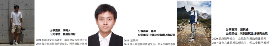 为了与不同届同学们分享就业方向与求职经验,与同学们互动答疑,搭建不同届员工间的对话平台以形成互帮互助、经验交流的良好氛围,真正将优秀案例与经验心得总结传承,本次“学长学姐经验分享会”分别邀请了郭岸、李树人、温良涵三位优秀的前辈,他们分别选择了地产、选调、设计院三个不同的就业方向,将从不同方面和同学们进行经验交流。