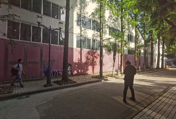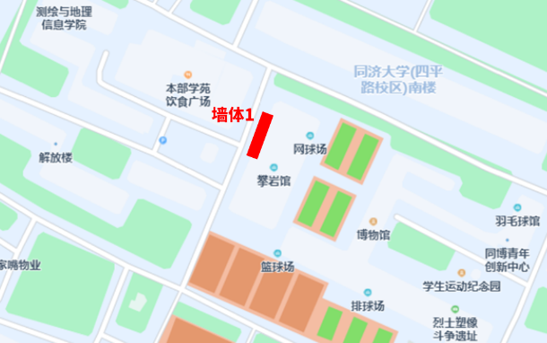 图1——墙体1:位于攀岩馆(学苑食堂对面。左:现场照片,右:区位示意)