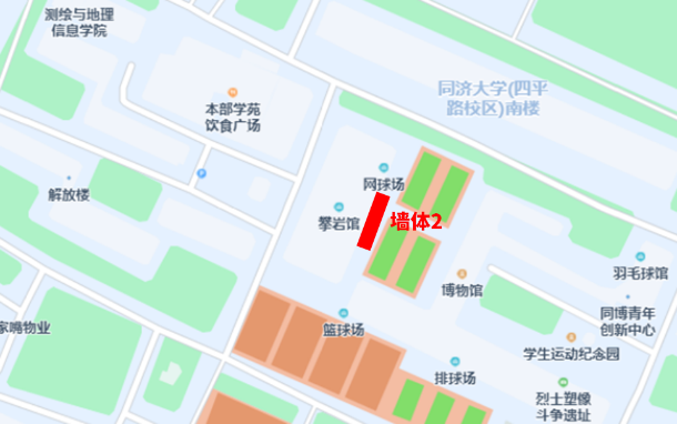 图2——墙体2:位于攀岩馆(网球场对面。左:现场照片,右:区位示意)