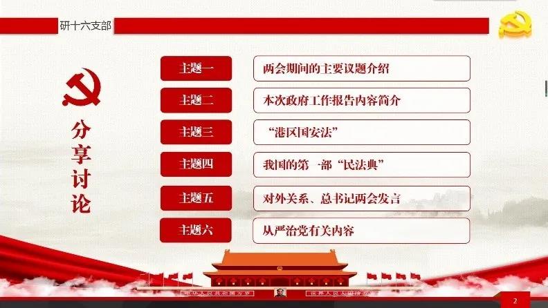 本次会议采用线上分享、观看视频的学习形式。重点围绕政府工作报告、港区国安法、民法典、对外关系等内容进行学习。共包含六个议题,分别是:两会期间的主要议题介绍、本次政府工作报告内容简介、“港区国安法”、我国的第一部“民法典”、对外关系与总书记两会发言,以及从严治党有关内容。