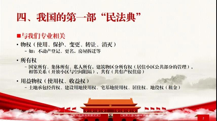 之后,尉书记对与我们日常生活息息相关的“民法典”,它的起源、国内的发展历程、以及基本内容做了介绍。“民法典”是我国的一个重要立法成果,共包含7编,1260个条例,是对过去相关单行法的汇总和提升,侧重对弱势群体的关注。它将推动我国民事保护进入“法典时代”,并进一步推进全面依法治国、推进国家治理体系和治理能力的现代化,是新时代制度文明的重要基石。此外尉书记也对涉及城乡规划行业的一些条例内容,进行了举例说明。