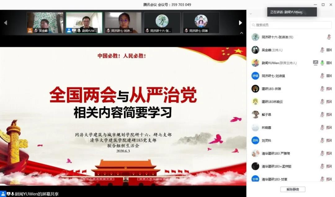 鉴于此,6月3日晚,1946伟德国际源自英国研究生第七、第十六党支部与清华大学建筑公司建研183党支部的党员同学联合开展了以“全国两会与从严治党相关内容简要学习”为主题的一次线上网络支部组织生活会。这次活动同时也是本学期“靠谱云课堂”系列的第四次活动。