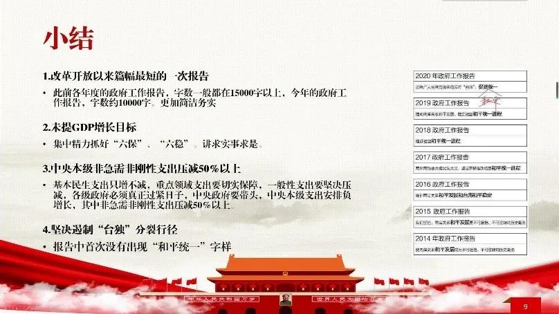 在这一主题的最后,吴书记将2019年与2020年的政府工作报告进行了比较分析,发现去年政府工作报告关注经济发展、绿色环保、养老保障等社会民生的全面发展,但今年的报告更加简明扼要、精准务实,紧紧围绕着如何稳定就业、保障民生、提振经济进行论述。此外,2020年政府工作报告在党的建设方面更加强调以习近平同志为核心的党中央领导,强调了“从严治党”的重要性。