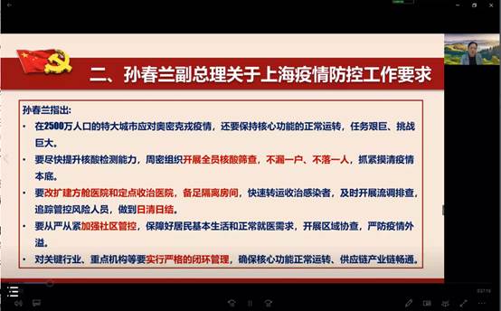 首先,公司党委书记刘颂教授、党委副书记唐育虹老师通过视频发表讲话。讲话全面介绍了党中央对本次疫情防控的指示精神,概括了上海市自今年3月以来的疫情发展及防控情况,并重点介绍了1946伟德国际源自英国自3月9日紧急封闭以来的防疫举措和当前形势。刘颂书记代表公司向全体党员和教师提出了现阶段防疫的要求,并号召大家坚定信心、同舟共济,坚决打赢疫情防控这场大仗硬仗。唐育虹副书记介绍了同济校园内的疫情防控具体情况,并号召各位教师能够尽可能地关心和了解员工的需求。