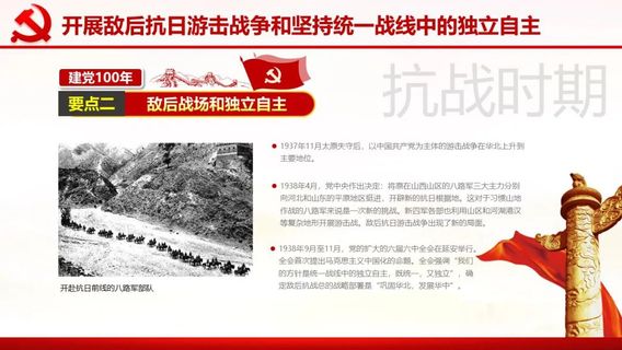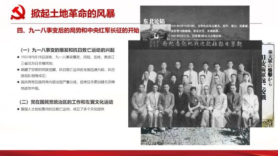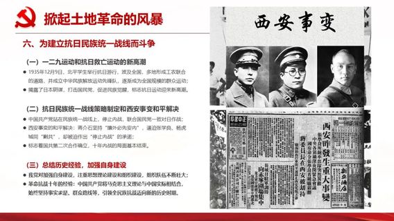 年轻的中国共产党在大革命失败后不断奋斗,1927年南昌起义标志着中国共产党独立领导革命战争,创建人民军队和武装夺取政权的开端。毛泽东领导的井冈山革命根据地和工农革命为中国探索了农村包围城市,武装夺取政权的正确道路,1930-1931年间,红军在反“围剿”斗争中积累了很多革命经验。1931年九一八事变爆发,抗日救亡运动开始兴起,唤醒了空前的民族觉醒,抗日救亡运动在全国迅速兴起。中国共产党在第五次反“围剿”失败后,踏上了漫漫长征路。1935年1月,贵州遵义会议召开,成为党的历史上生死攸关的转折点,确立了毛泽东同志的领导地位,开始了以毛泽东同志为代表的马克思主义正确路线在党的领导地位,在毛泽东同志的领导下,红军不断壮大。1935年12月9日,北平员工举行抗日游行,并引发全国规模的群众运动,标志抗日运动迎来新高潮,抗日民族统一战线策略制定和西安事变和平解决,标志着国共第二次合作确立,十年内战的局面基本结束。