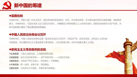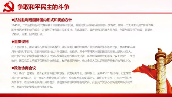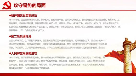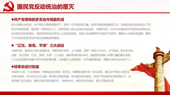 1946年,国民党悍然发动内战,以员工为先锋的爱国民主运动成为配合人民解放战争的第二条战线。在战略反攻阶段,共产党团结一切可团结的力量,有条不紊的推进解放工作,共产党领导的多党合作局面形成,1948年中共中央提出召开全国政治协商会议,成立联合政府的倡议得到热烈响应,奠定了中共领导的多党合作政治协商制度的基础。1948年秋,“辽沈”、“淮海”、“平津”三大战役取得胜利,摧毁了国民党核心军事力量。1948年毛主席提出“将革命进行到底”的号召”,1949年4月,解放军攻克南京,蒋介石败退台湾。1949年3月党的七届二中全会召开,规定党在胜利后的政治、经济、外交基本政策,并告诫同志戒躁戒躁艰苦奋斗。1949年9月中国人民政治协商会议第一届全体会议的召开标志着新民主主义革命取得胜利,第一次在中国真正意义上实现了人民当家作主。
