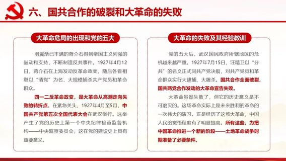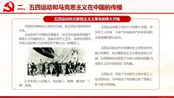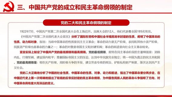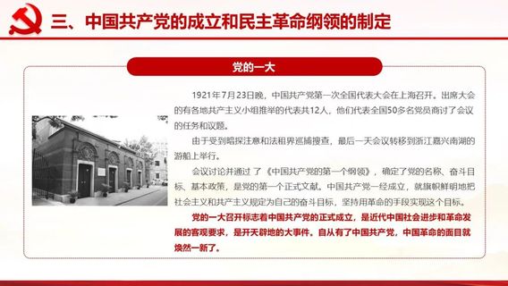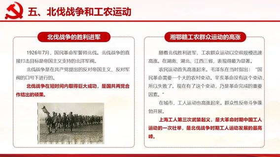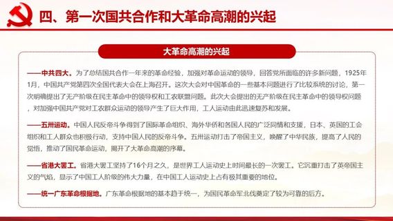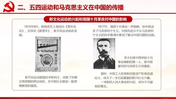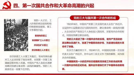 1915年李大钊在上海创办《青年杂志》后改为《新青年》,新文化运动由此发端;1917年,俄国十月革命给中国送来了马克思主义,李大钊成为扛起旗帜的第一人。中国巴黎和会上的外交失败,是五四运动直接导火线,是近代中国革命史上具有划时代意义的事件,代表着民族意识的觉醒。1921年7月23日晚,中国共产党第一次全国代表大会在上海召开,最后一天会议转移到浙江嘉兴南湖的游船上游行,讨论并通过了《中国共产党的第一个纲领》,标志着中国共产党的正式成立。1922年召开二大。工人阶级的政治觉悟和组织程度明显提高,香港海员罢工、安源路矿工人大罢工等等。1923年6月中国共产党第三次会议在广州召开,提出新三民主义,成为国共合作的基础。中共四大提出了无产阶级在民主革命中的领导权问题,五卅运动和省港大罢工等等均体现了工人阶级的力量,1926年7月北伐战争胜利进军,是国共两党合作的硕果,同时,湘鄂赣工农群众运动高涨,上海工人第三次武装起义是大革命时期中国工人运动的一次壮举,是北伐时期工人运动最高峰。1927年4月12日蒋介石发动反革命政变,是大革命从高潮走向失败的转折点。党的五大后,中国革命推进到一个新阶段,为土地革命战争准备了必要条件。