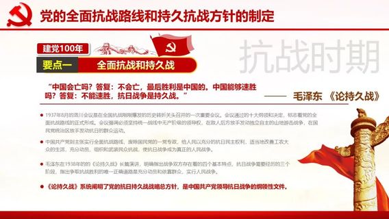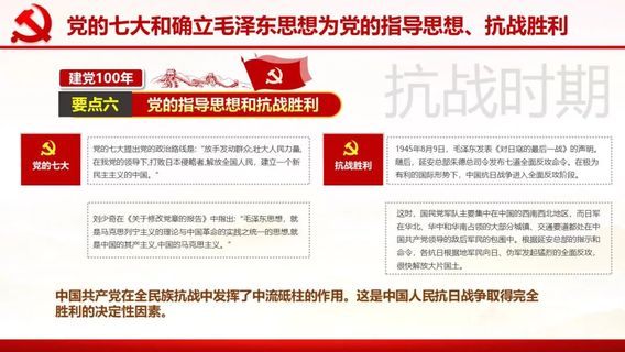 1937年8月的洛川会议是在全国抗日战争刚刚爆发时,历史转折关头召开的一次重要会议,标志着党的全面抗战路线的正式形成。战略相持阶段国民党内部分裂严重,面对这样的形式,中国共产党以大局为重,并在艰苦的敌后战争中,发动大生产运动使党和人民的血肉联系加强,发动抗日民主运动巩固扩大了抗日民族统一战线。1939年10月,毛泽东发表《<共产党人>发刊词》,提出了党的建设的总目标总任务,党的七大提出以毛泽东思想为党的指导思想。1945年8月日本最终投降,在这一过程,中国共产党发挥了中流砥柱的作用,是中国人民抗日战争取得完全胜利的决定性因素。