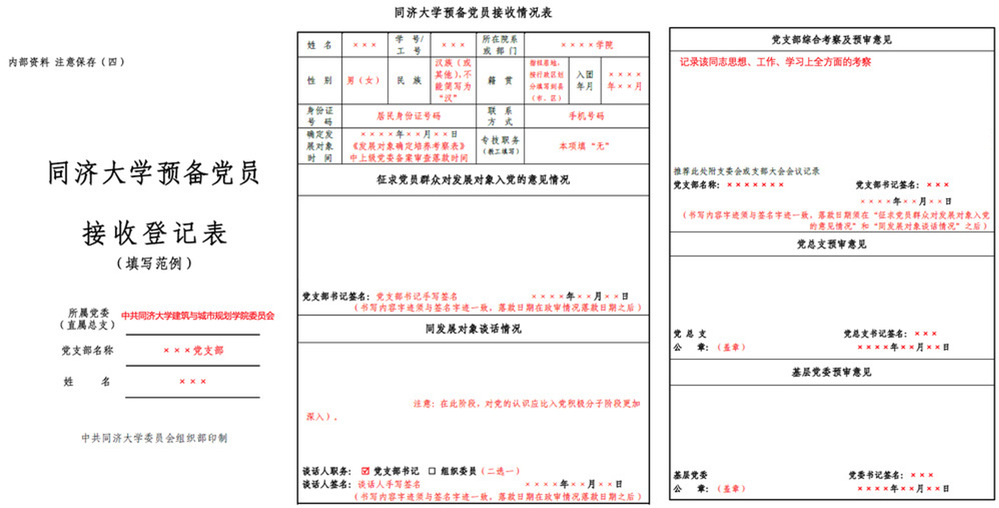 (1)预备党员接收登记表(四)(注:“党总支预审意见”和“基层党委预审意见” 空着不写,填写格式详见图1);