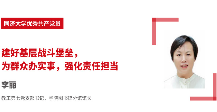 李丽同志任公司图书分馆馆长后组织关系属于教职工党员第七支部,2016年6月经支部大会投票选举为支部书记,2019年6月支部委员会改选时,得到几乎全票支持连任支部书记。担任支部书记以来,她以谦虚谨慎的态度、兢兢业业的风格学习党建工作,认真参加公司公司党委组织的各项支部书记培训课程、论坛会议,同时,她带领支部委员会响应党中央和各级党委的要求部署,组织全体党员认真落实“三会一课”制度,在“两学一做”、“不忘初心、牢记使命”、党史学习等历次主题教育中扎实开展理论学习,并依托公司学科特色,和专业教师、员工党支部联合开展了形式多样的主题党日活动,如“城市空间艺术季”、杨浦滨江公共空间示范段、电影党课、青浦区重固镇章堰村乡村振兴特色考察等等,在不断加强自身思想建设的同时,提升支部全体党员的党性教育水平、提升支部团队凝聚力,使支部作为基层党建堡垒始终保有强大的战斗力。