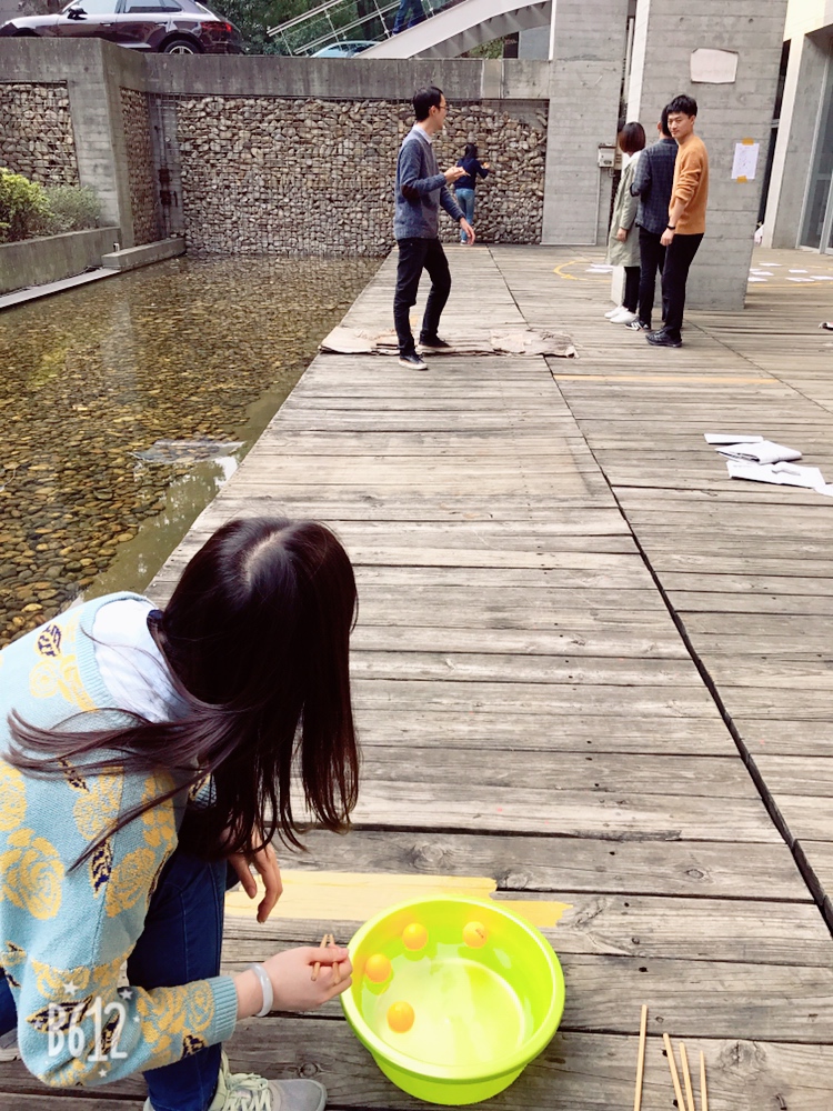 第一个环节是夹乒乓球,每队选出3个人,开始乒乓球的传递活动。
