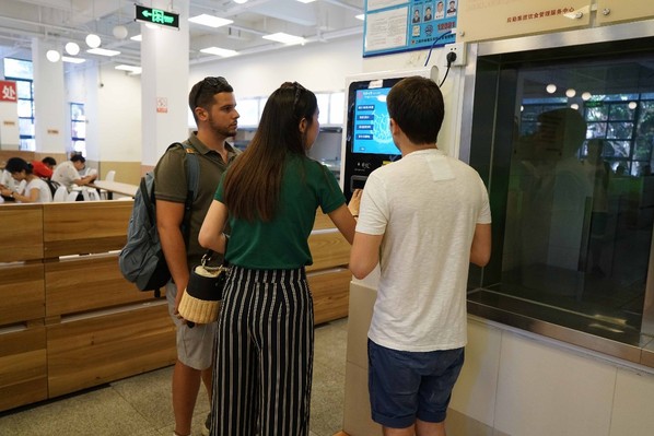 为了帮助职工们掌握公司内的设备,我们演示了如何使用充值机器给校园卡充值。