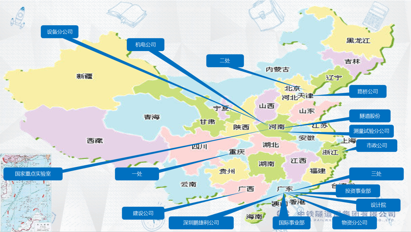 下辖8个施工型子分公司,分布情况为:隧道股份总部在郑州、一处总部在重庆、二处总部在河北燕郊、三处总部在深圳、建设公司总部在南宁、路桥公司总部在天津、市政工程公司总部在杭州、机电工程公司总部在洛阳;同时,设有7个功能型子分公司,分别是:勘测设计研究院、盾构及掘进技术国家重点实验室,投资发展事业部,设备分公司、物资分公司、测量试验分公司、国际事业部,以及8个片区指挥部、18个省级营销分公司和10个境外分支机构。