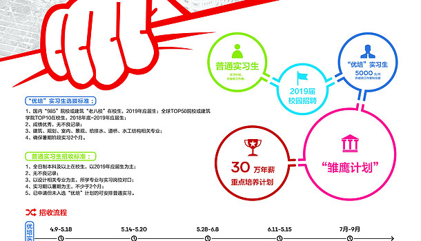2019届校园招聘开始引入“雏鹰”特别计划,每年约10个名额,聚焦于设计相关专业的优秀应届生,入选后将享受30万年薪、重点培养计划。