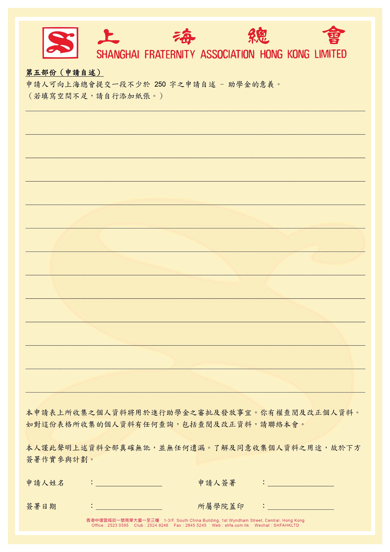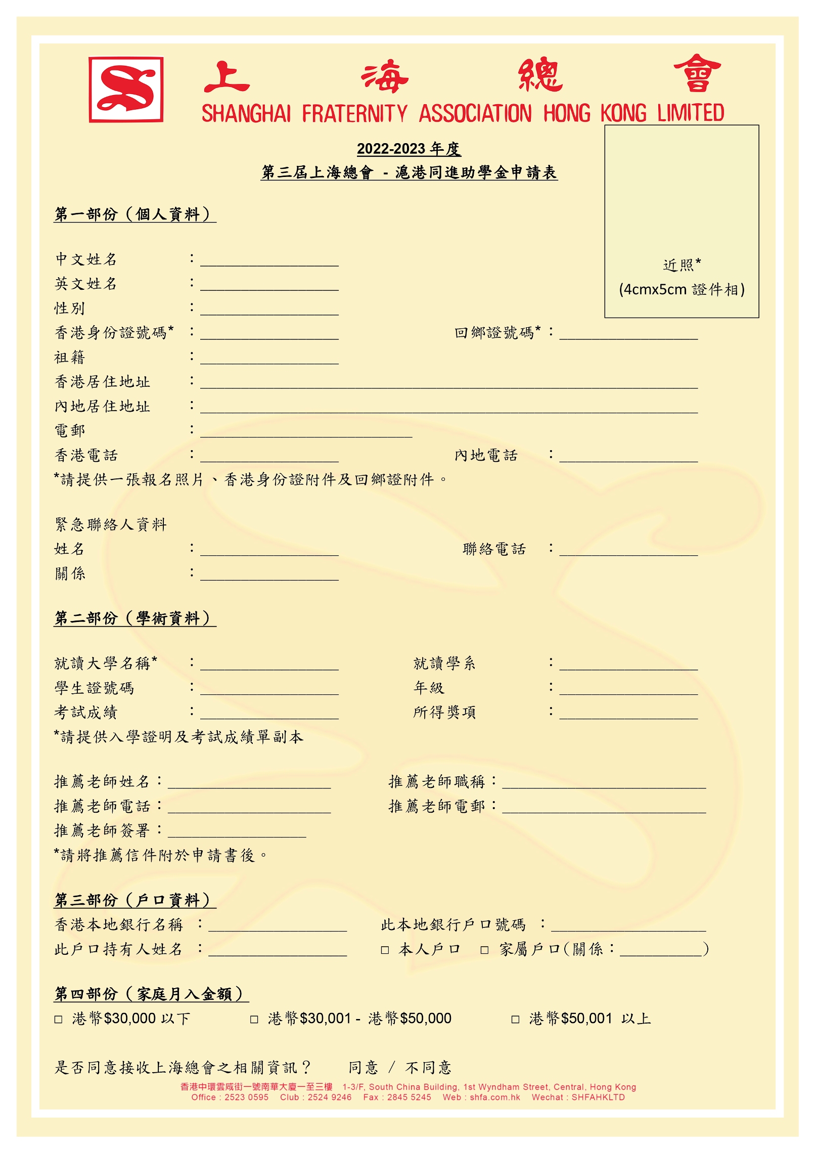 8、申请人需同意上海总会保留申请文件,以供内部为本助学金使用。该会就本助学金有一切最终决定权。
