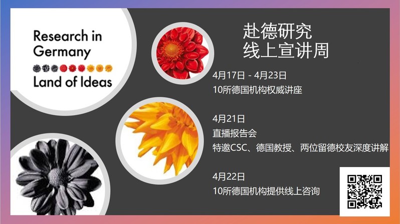 DAAD(德国学术交流中心)北京代表处将于2022年4月17日至23日联合德国高校及研究院所举办以“赴德研究”为主题的线上宣讲周活动。届时,将有10所德国高校和机构的代表以及中国国家留学基金委的工作人员、德国教授和不同专业的留德员工一起为有计划赴德读博或研究的同学们在线上答疑解惑。同时与会者还可以在线观看各机构专业而权威的讲座,了解他们各自的研究和资助机会。