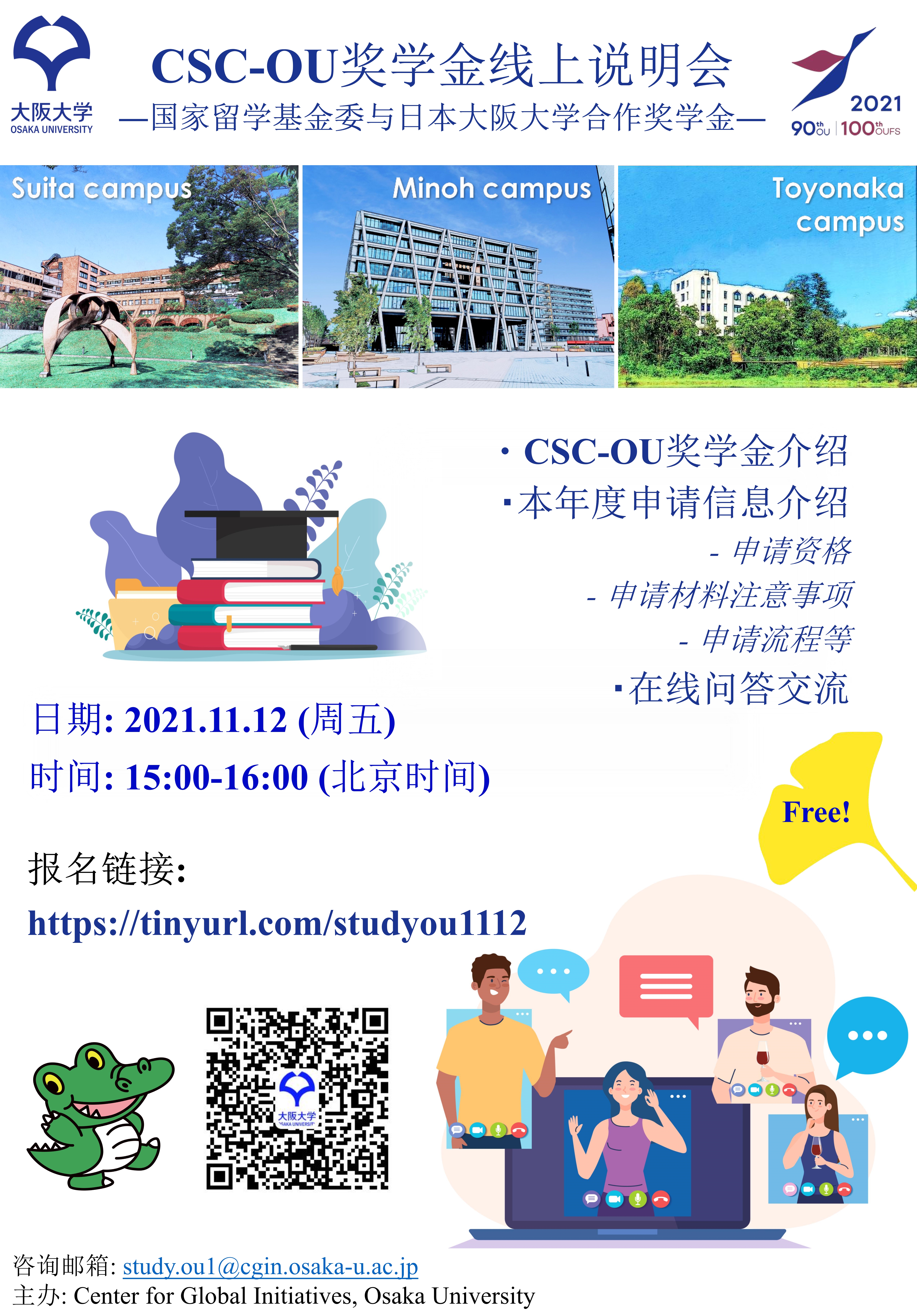大阪大学将于11月12日下午15至16点在线举行说明会进行奖学金介绍,申请资格,材料,注意要项,流程,在线问答交流,感兴趣的同学请关注。