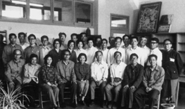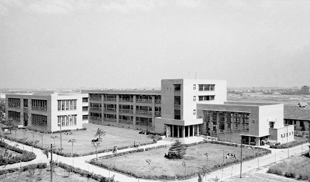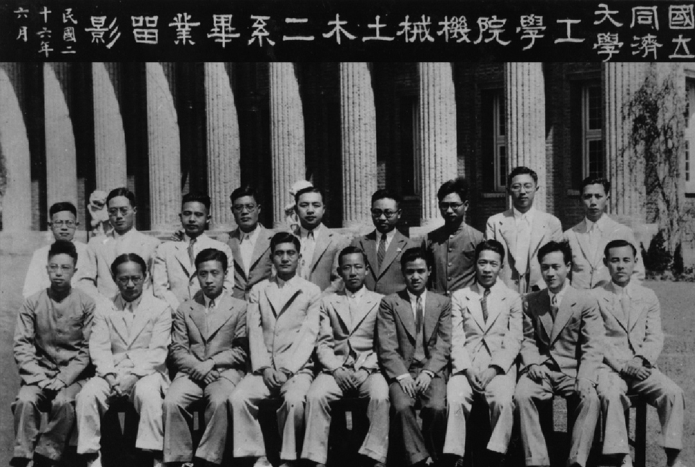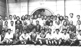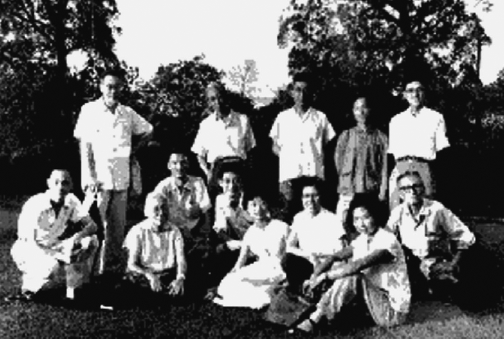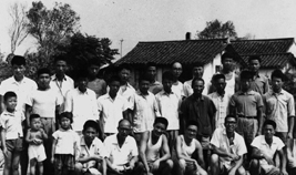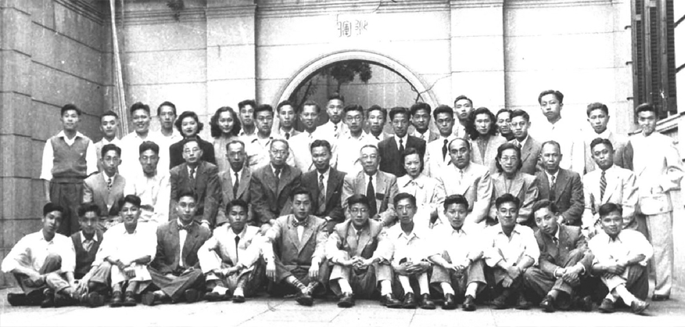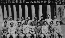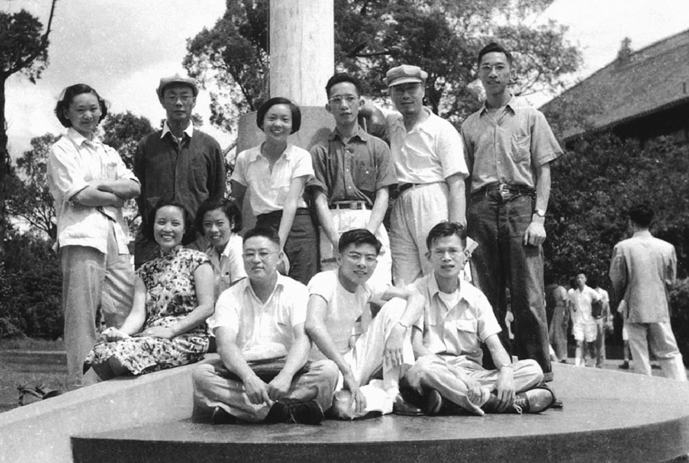 1950年圣约翰建筑系教师黄作燊和员工在自己设计的旗杆前